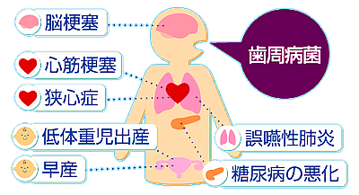 最近の研究では、歯周病原菌の出す毒素が血管を巡り、全身的な影響として以下のような悪影響を及ぼすことが分かってきています。